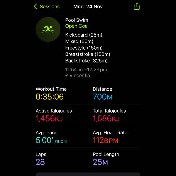 Monday 24th Nov Today I achieved and Surpassed my goal of 9 km swimming a total of 9.5 km.